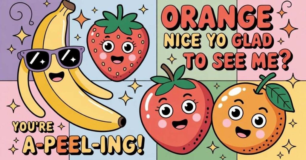 They work so well because fruit names naturally lend themselves to clever wordplay. Words like “peel,” “squeeze,” “zest,” “ripe,” and “berry” all sound close enough to other common words that a small twist creates an instant laugh.