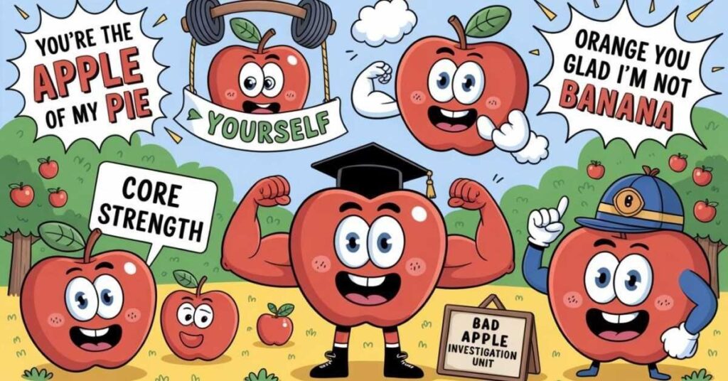 Additionally, apple fruit puns are especially popular for teachers, parents, and anyone celebrating something school related. As a result, they bring a wholesome and clever energy that feels both warm and witty at the same time.