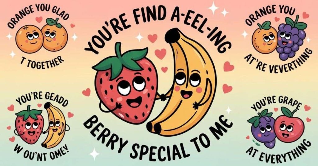 These couple fruit puns are going to become your new favorite way to express affection. They blend sweetness with humor, which makes them ideal for anniversary cards, love notes, Valentine’s Day messages, and everything in between.