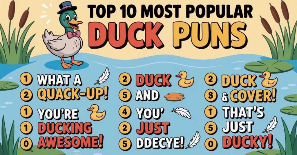 Duck puns deliver instant smiles whether you’re crafting birthday messages, social media captions, or classroom activities. In essence, the key is matching the right pun to the right moment: cute puns for heartfelt messages, cheeky one-liners for friends, and professional puns for workplace humor. To start, begin with the classics in our Top 10 table.