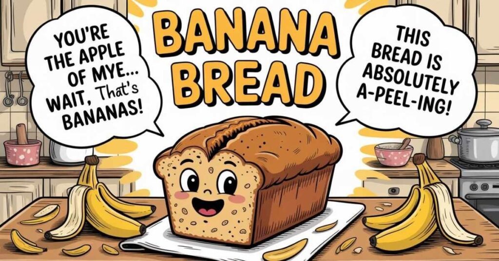 Banana bread puns layer fruit humor over bread wordplay making them twice as shareable. Additionally, they’re ideal for Instagram baking posts, Valentine’s cards, and school lunchbox notes.